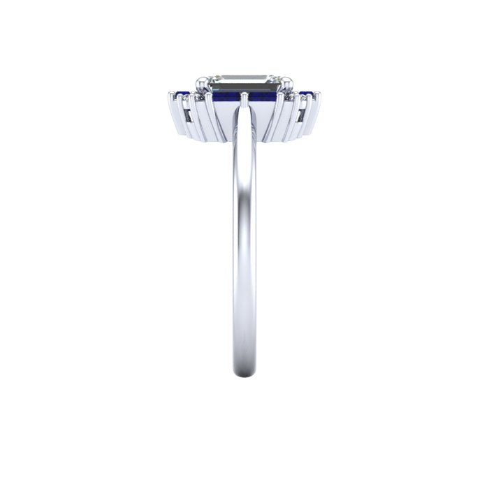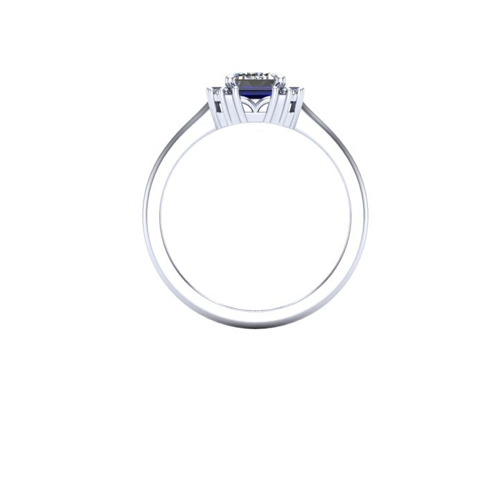 This custom designed engagement ring was inspired by the Art Deco period. The setting is recycled platinum and is set with an emerald cut diamond surrounded by sapphire baguettes and round cut diamonds.