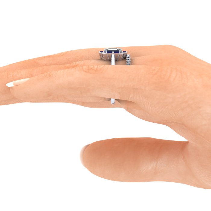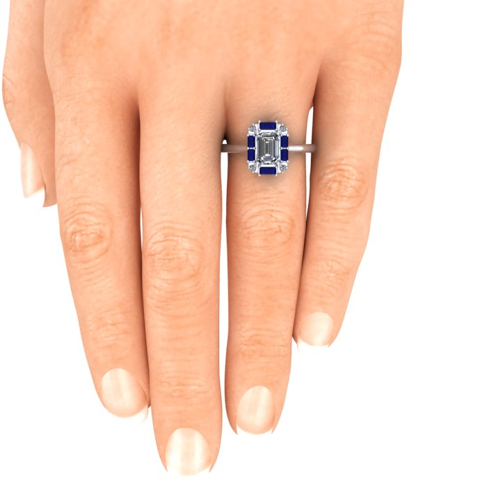 Halo: 4 round cut diamonds, size 1.30 mm, 6 sapphire baguettes, sizes 3.50 x 1.50 mm and 2.50 x 1.50 mm