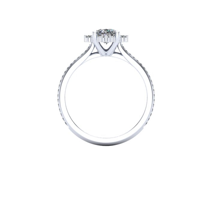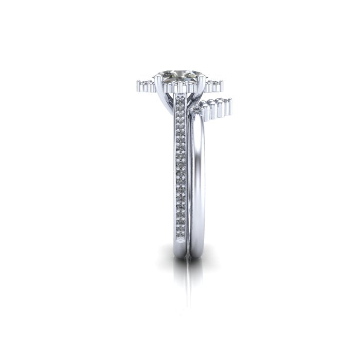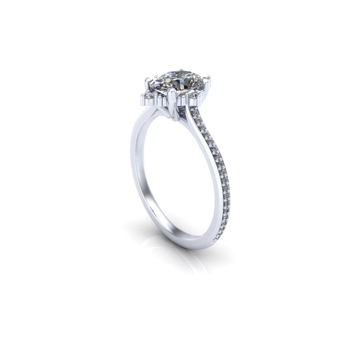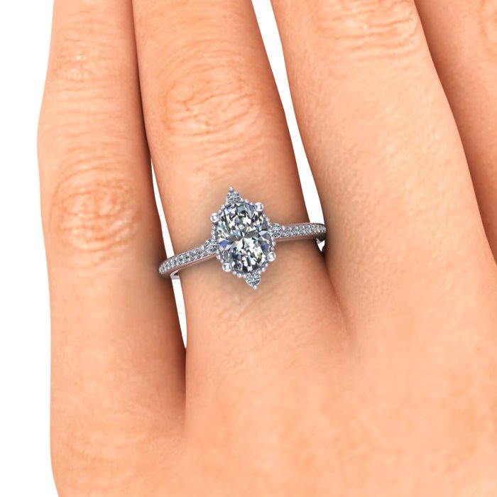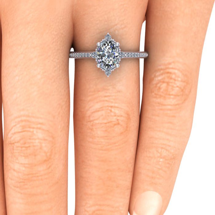 This vintage inspired engagement ring is very dainty with tiny milgrain beads and tiny lab grown diamonds. The center diamond is an oval lab grown. The metal used in this ring is recycled making this ring ethical and earth friendly.