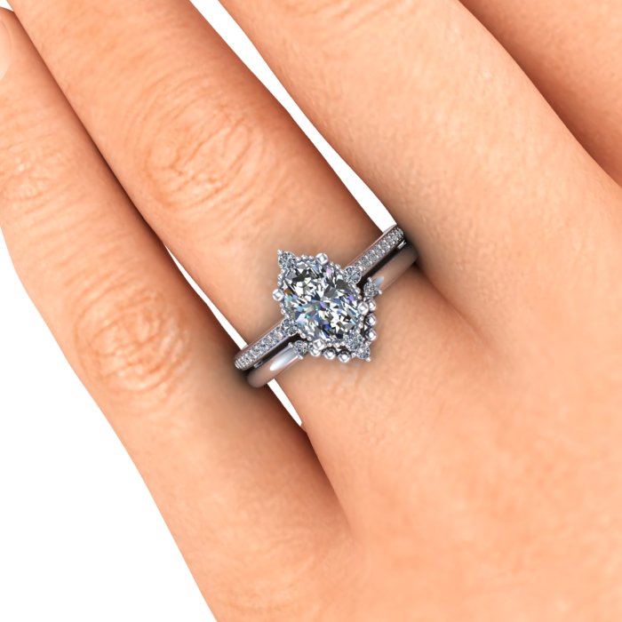 The wedding band featured is sold separately. Please contact me for details.