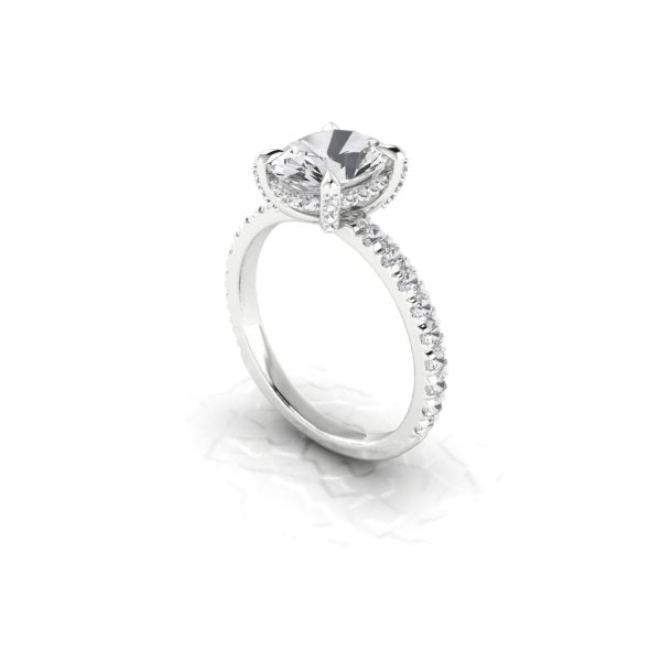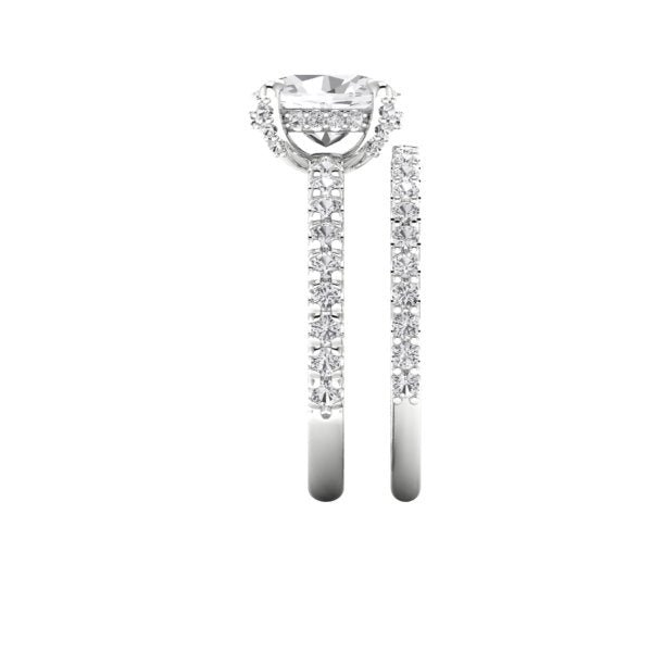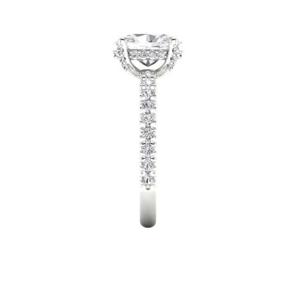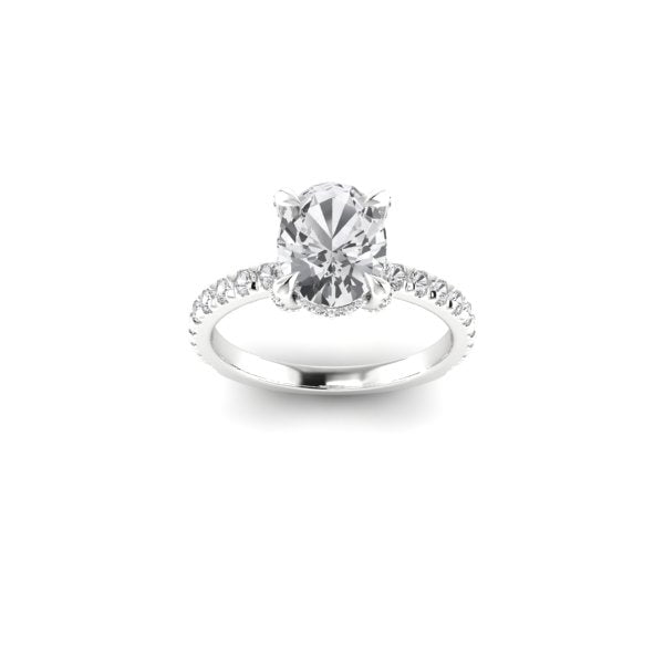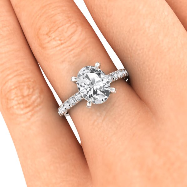 A stunning 9.5 x 7 oval lab grown diamond is set in recycled platinum and surrounded by tiny accent lab diamonds. Gorgeous and earth friendly!