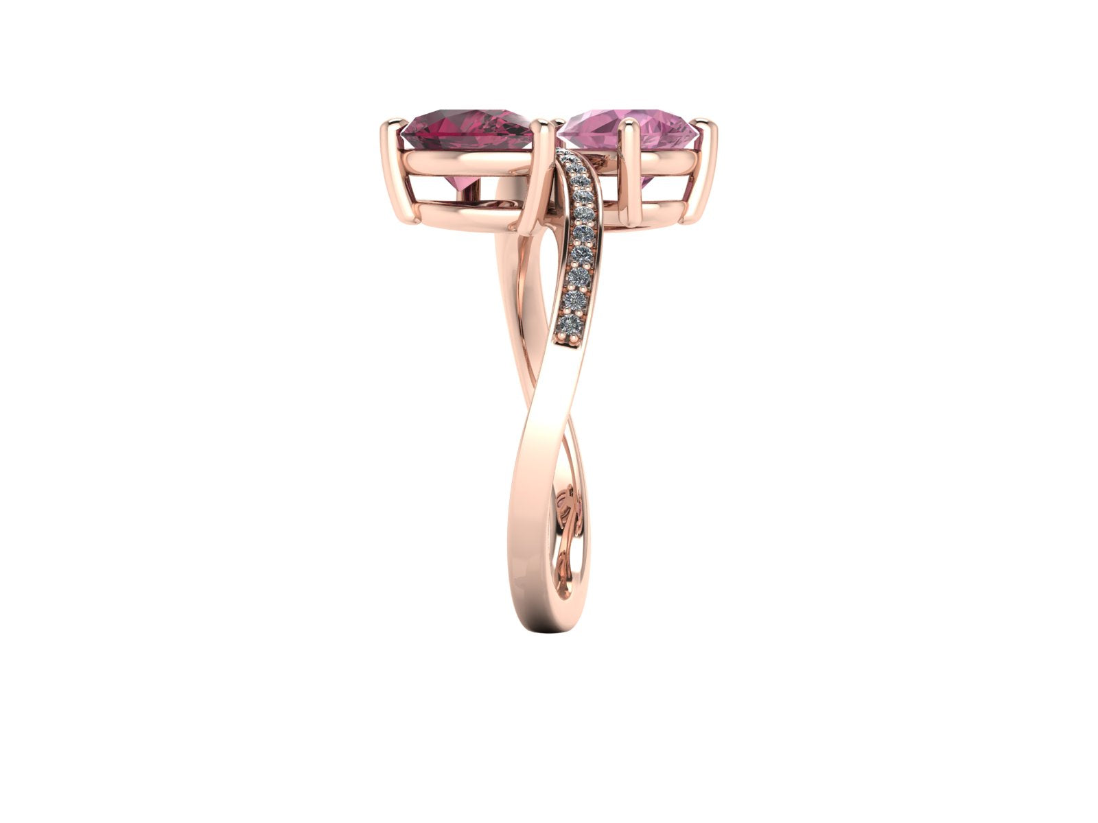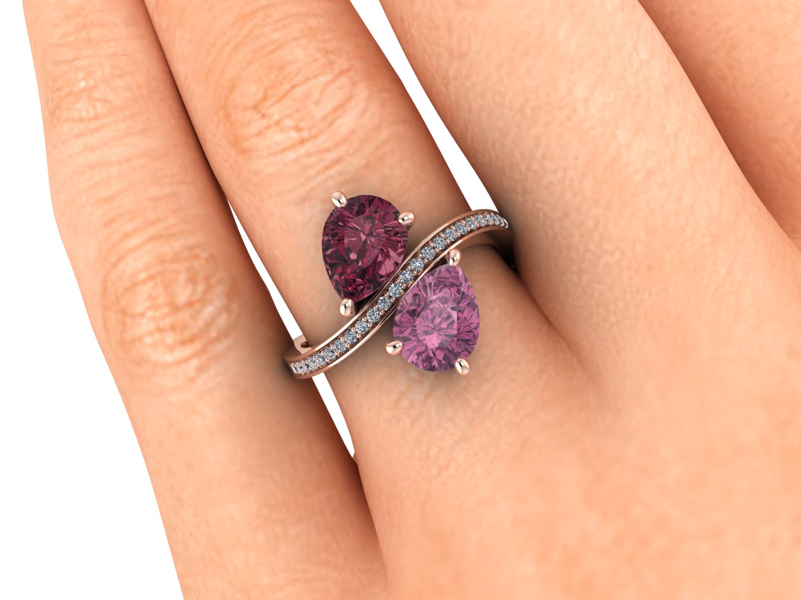 If you like contemporary jewelry pieces, then you'll love this ring. It has a bypass style setting and is cast in 18k rose gold. There are 2 9x6 mm pear shaped natural birthstones, one is a rhodolite garnet for January, the other is a pink tourmaline for October. If you have a need for different birthstones, contact me. I can set just about any gemstone your require. Contact me for details and price.